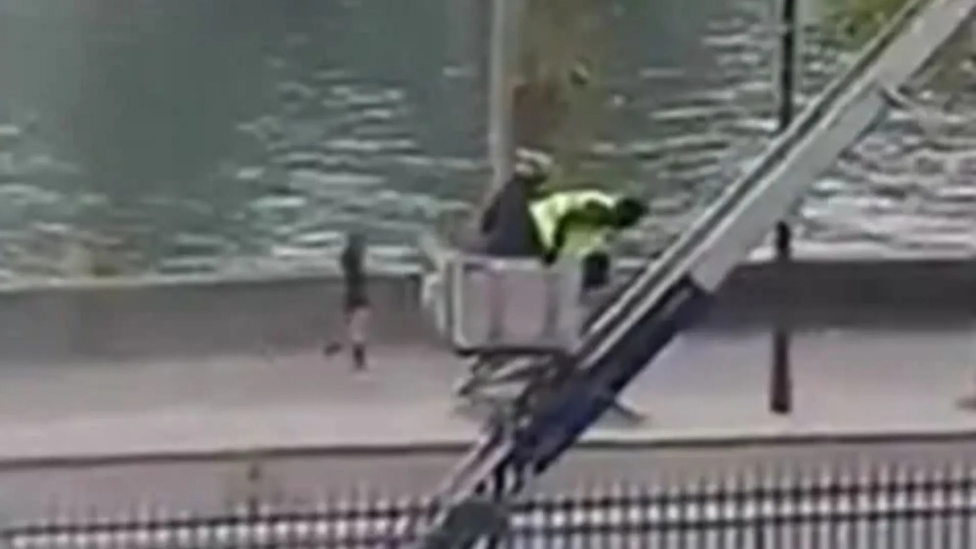 The video shows two masked men, one wearing a high vis and the other in full motorbike gear, standing in the box of a cherry picker-style mechanical ladder just after 9:30 on Sunday morning.